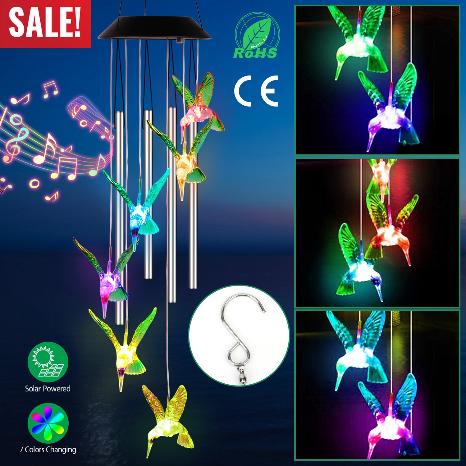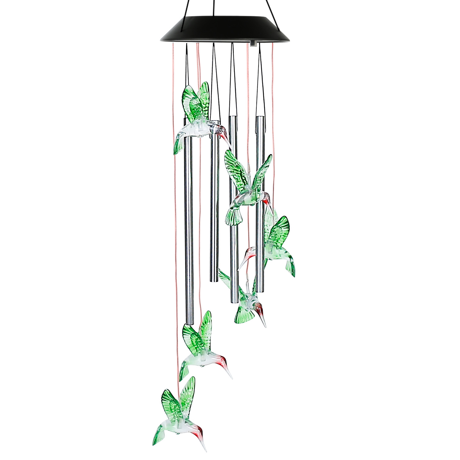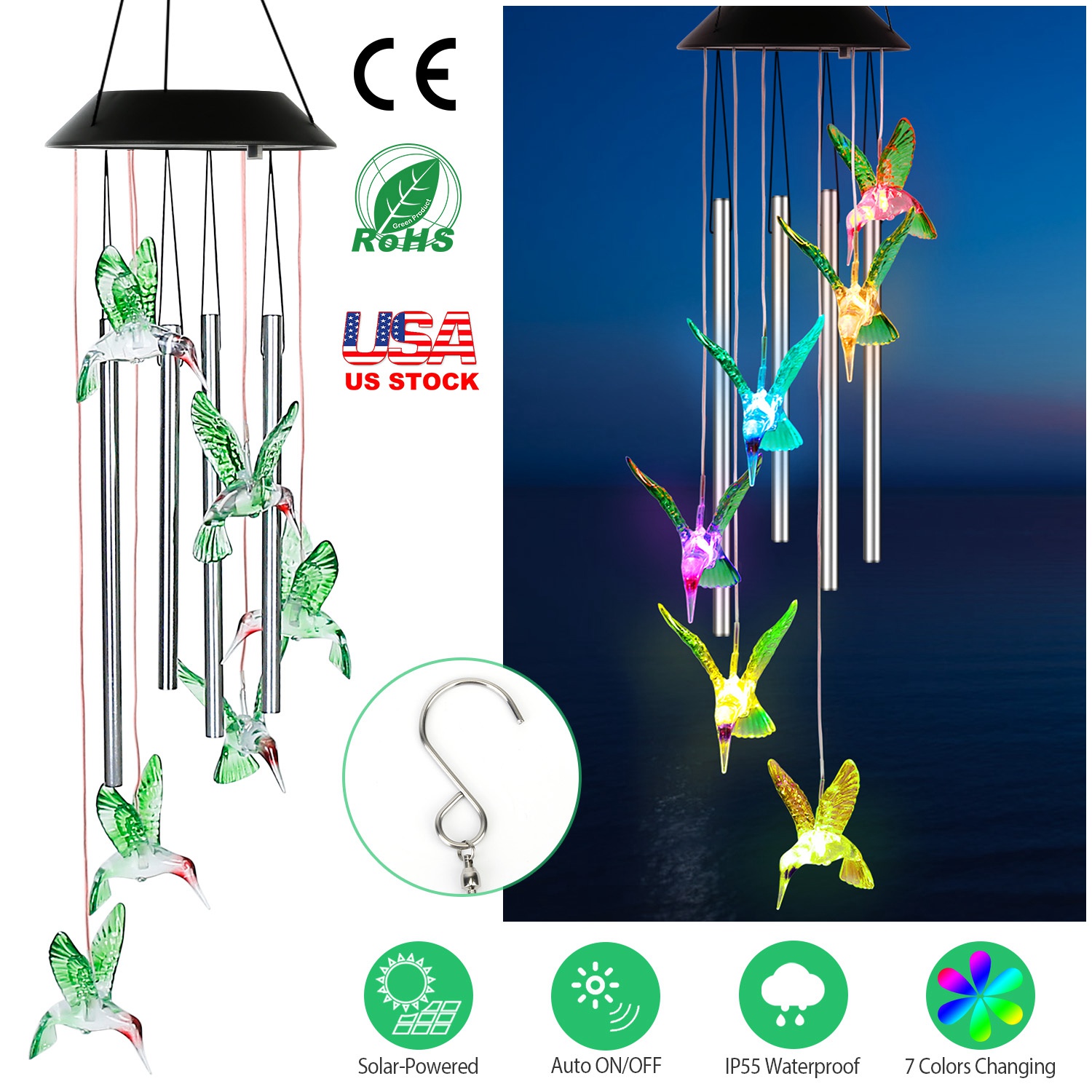 Mini chimes bring delightful sound, featuring 6Pcs color changing LED hummingbird illuminating at night, calmly and softly changing from one color to the next. Mixing with the collision tube, it creates a longer lasting deep tone. Auto ON/OFF and sensitive light sensor, it is an exquisite and elegant decoration for your garden, yard, patio, etc. Built-in 600mAh rechargeable battery can last up to 12hours working time after fully charged. IP55 waterproof performance enables it to withstand bad weather in the open, perfect for outdoor decoration.