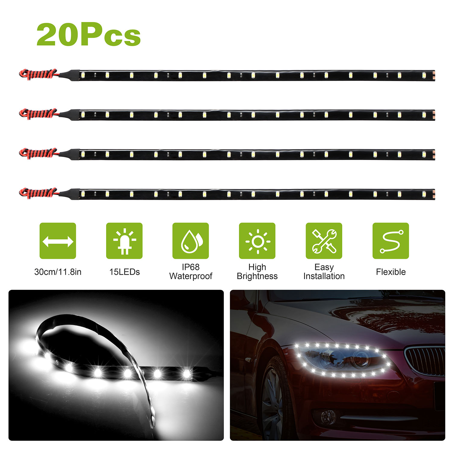 20Pcs 12V Auto LED Light Strip 11.8-inch 15 LEDs Flexible IP68 Waterproof LED Strip for Motorcycle Car Truck SUV Exterior Interior Decoration White