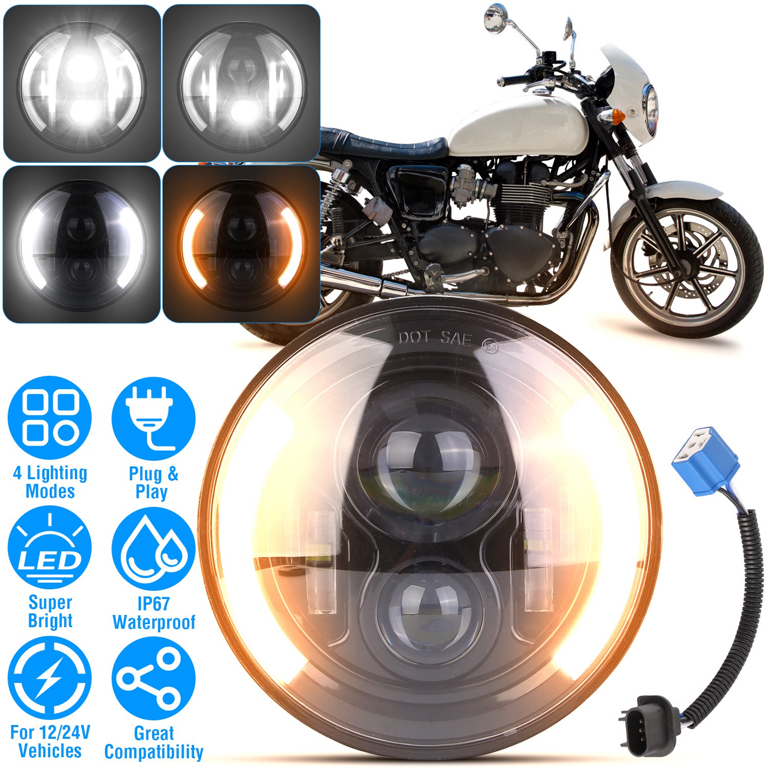 Our 7In LED headlight provides a supper bright illumination with up to 3800lm brightness for high beam and 1800lm brightness for low beam. Designed with halo which can be used as DRL guide light with white light or as turn signal light with amber light to improve driving safety. Compatible with 12/24V vehicles such as motorcycle and Jeep Wrangler JK/ LJ/ CJ/ TJ and more. Included H4 to H13 adapter makes it simply plug and play for convenient use. Constructed with durable die-casting aluminum alloy, PC lens and 2 air holes at the back, it’s IP67 waterproof and has better heat dissipation, ensuring a long lifespan up to 30,000 hours.