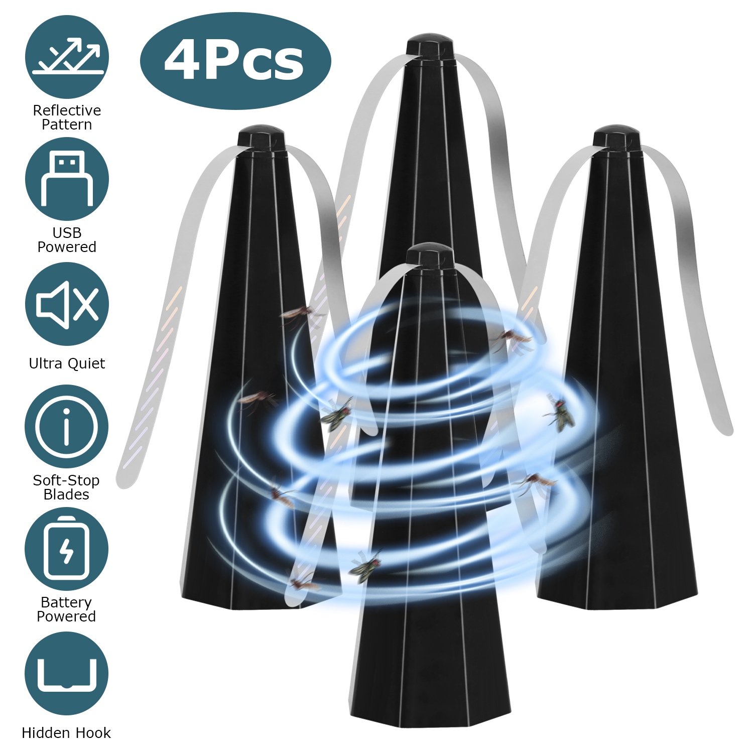 Flies are sensitive to light and sudden changes in their visual environment. Equipped with holographic blades with reflective patterns, our bug fan creates a flies-hated radius on table, effectively preventing annoyed flies or insects from interrupting your tranquility of meal. Battery and USB powered. A hook at the bottom to hang the fan upside down, freely use indoors and outdoors. Ultra quiet to notice the noise when using, definitely will not disturb you. One fan covers a dining table for 1-2 people. For larger tables, 4 fly repellent fans are wide enough to cover a wider area for gatherings and celebration occasions. Perfect for indoor restaurants, outdoor patio parties, camping, barbecues, picnics and sunbathing etc..