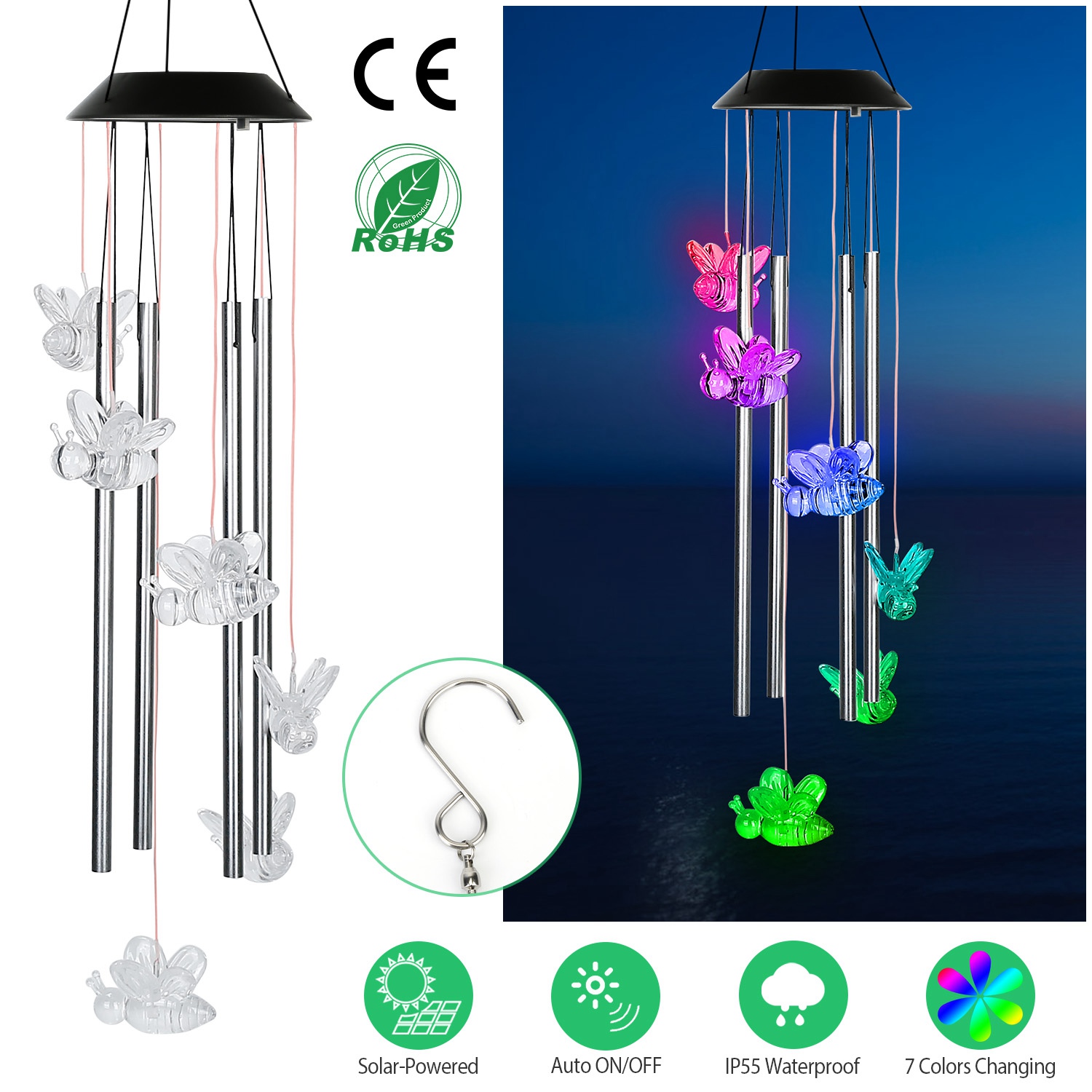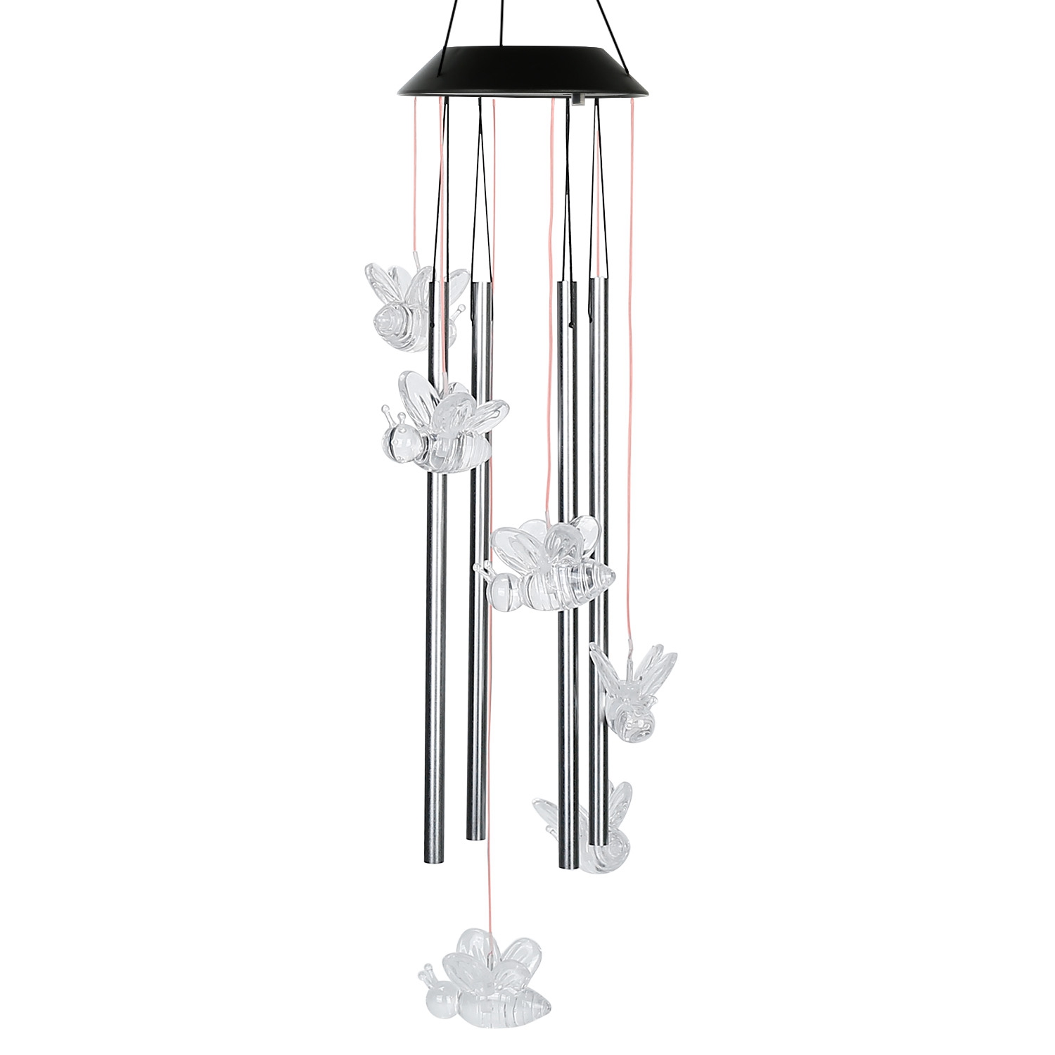 Mini chimes bring delightful sound, featuring 6Pcs color changing LED bee illuminating at night, calmly and softly changing from one color to the next. Mixing with the collision tube, it creates a longer lasting deep tone. Auto ON/OFF and sensitive light sensor, it is an exquisite and elegant decoration for your garden, yard, patio, etc. Built-in 600mAh rechargeable battery can last up to 12hours working time after fully charged. IP55 waterproof performance enables it to withstand bad weather in the open, perfect for outdoor decoration.