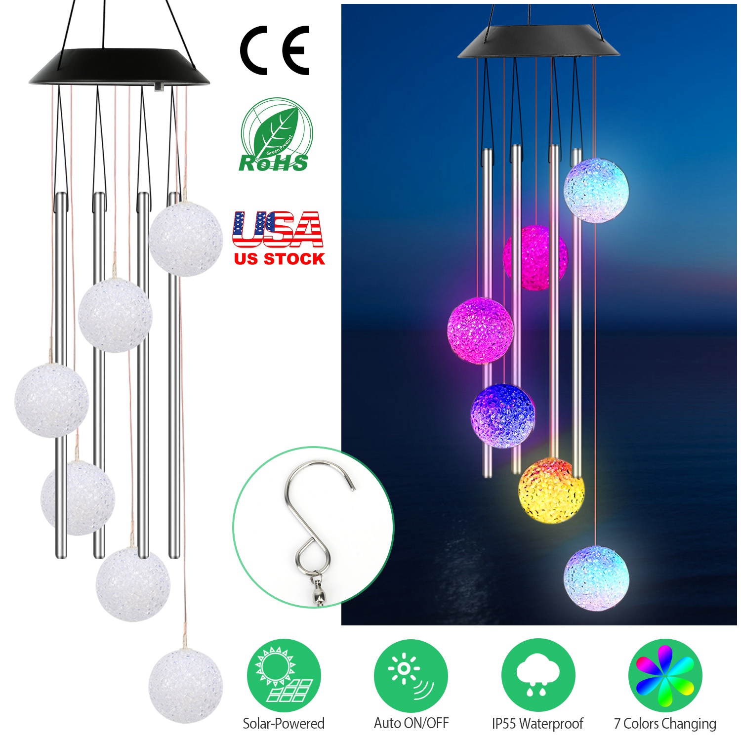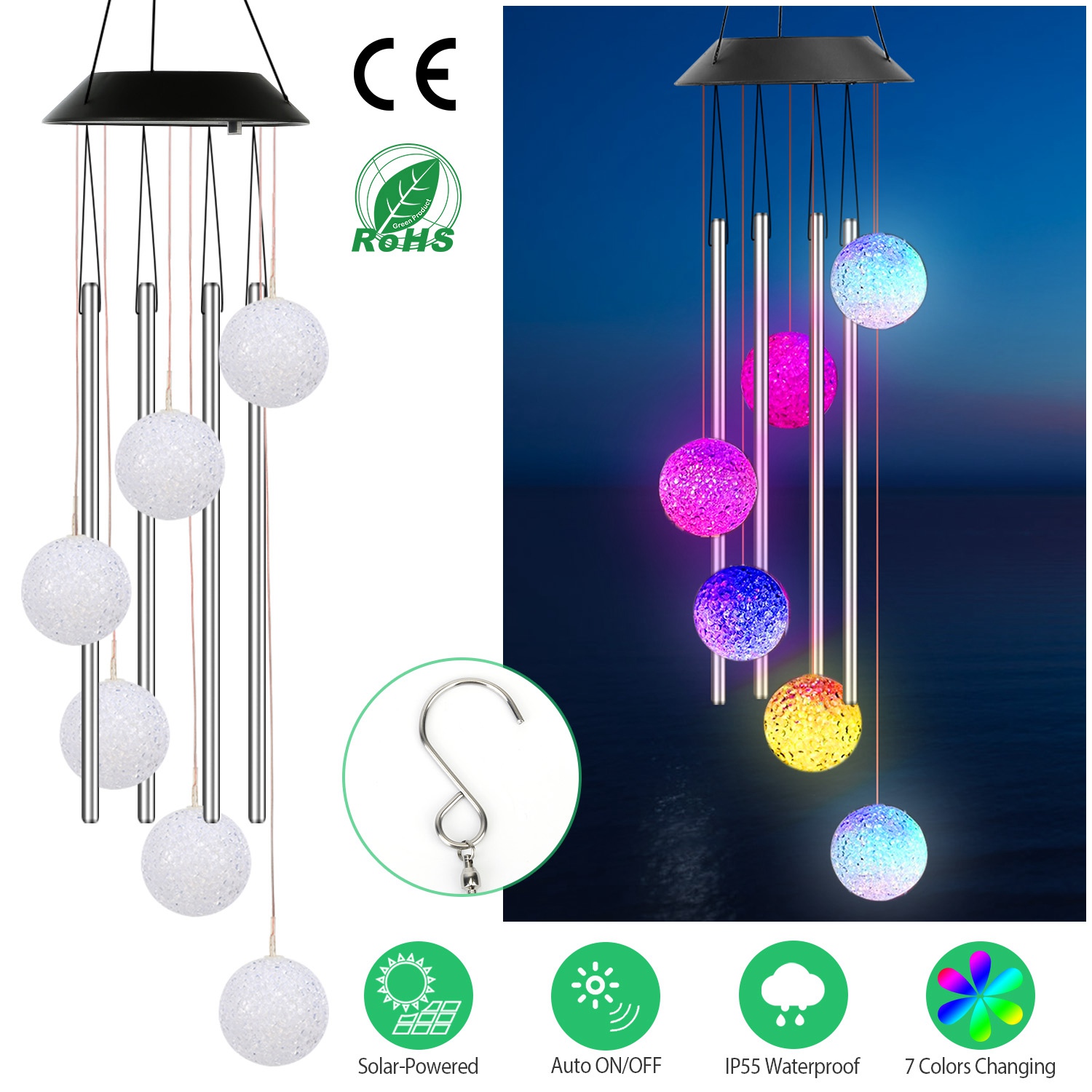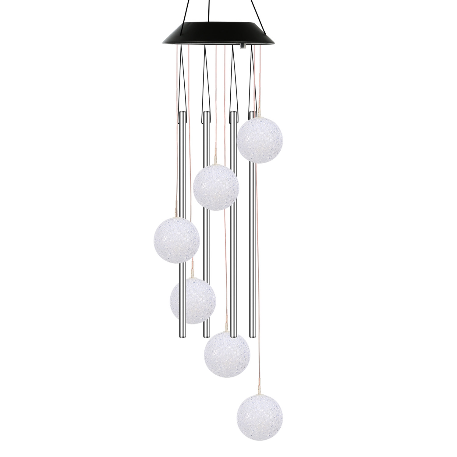 Mini chimes bring delightful sound, featuring 6Pcs color changing LED ball illuminating at night, calmly and softly changing from one color to the next. Mixing with the collision tube, it creates a longer lasting deep tone. Auto ON/OFF and sensitive light sensor, it is an exquisite and elegant decoration for your garden, yard, patio, etc. Built-in 600mAh rechargeable battery can last up to 12hours working time after fully charged. IP55 waterproof performance enables it to withstand bad weather in the open, perfect for outdoor decoration.