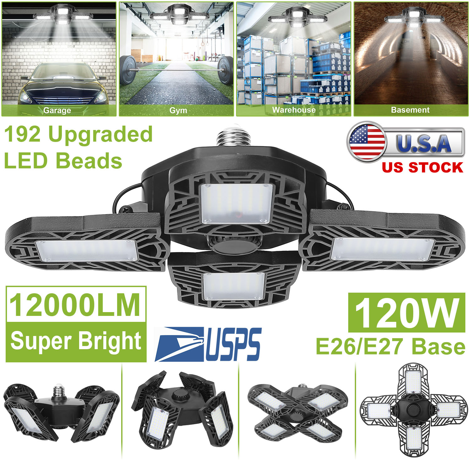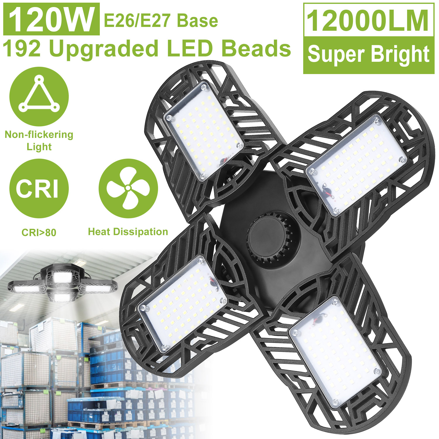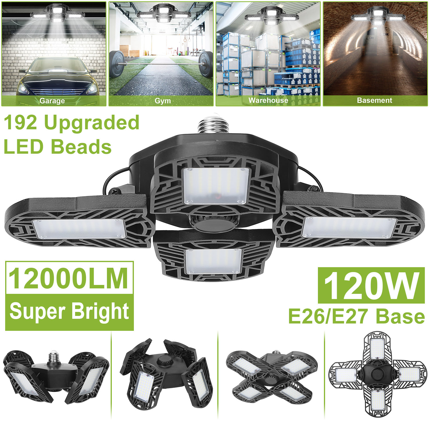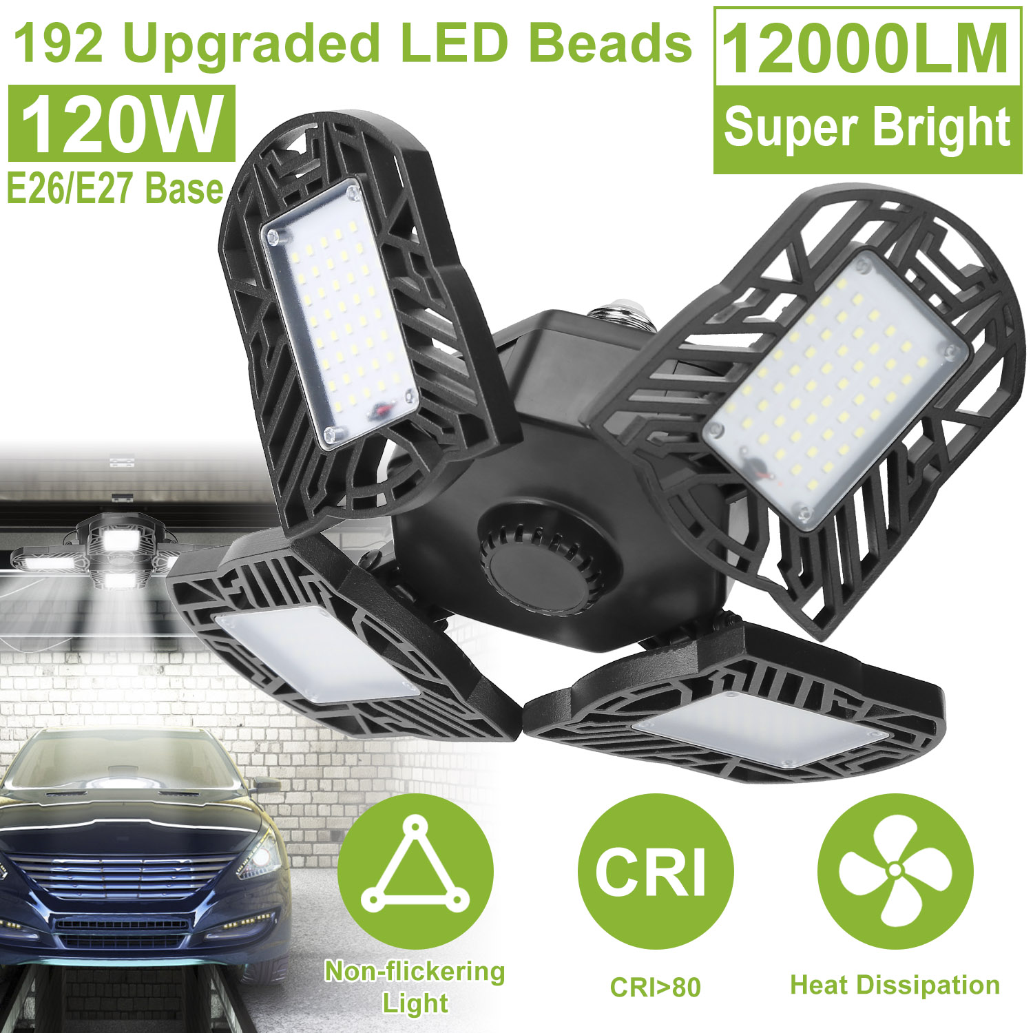Our LED garage light, comes with 12000 lumens, overall 192pcs upgraded LED chips, 90° adjustable lighting heads and nearly 360° lighting coverage, provide brightness for 538 square feet area. Light up the entire room without blind spot. 80+CRI for better color rendition and no flickering. Venting holes and die-cast aluminum materials provide better heat dissipation and sturdy construction. Just plug in E26/E27 light bulb base, no tools required. Optimal for garage, warehouse, basement, workshop, barn, corridor, office, exhibition area, stadium, gym, and etc..