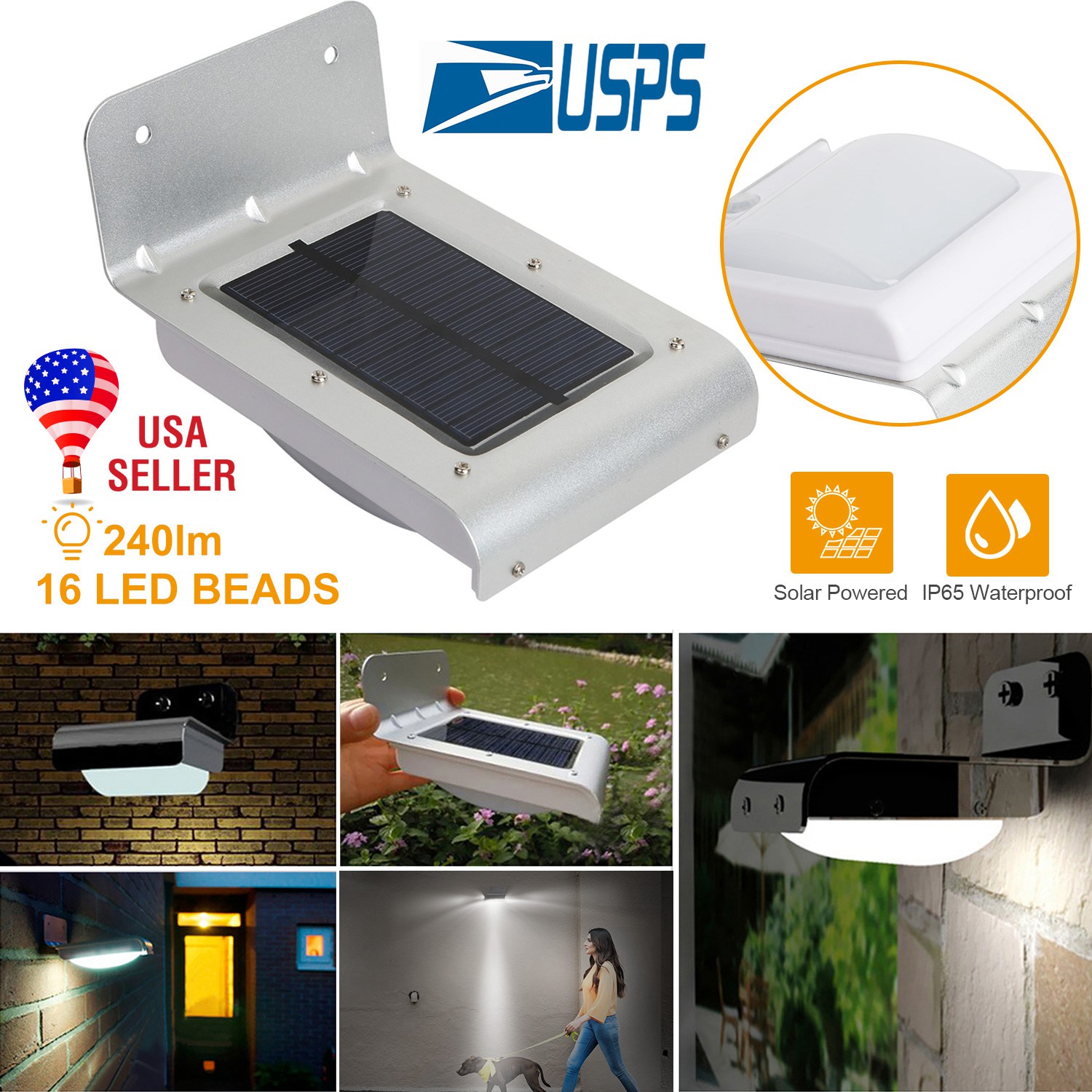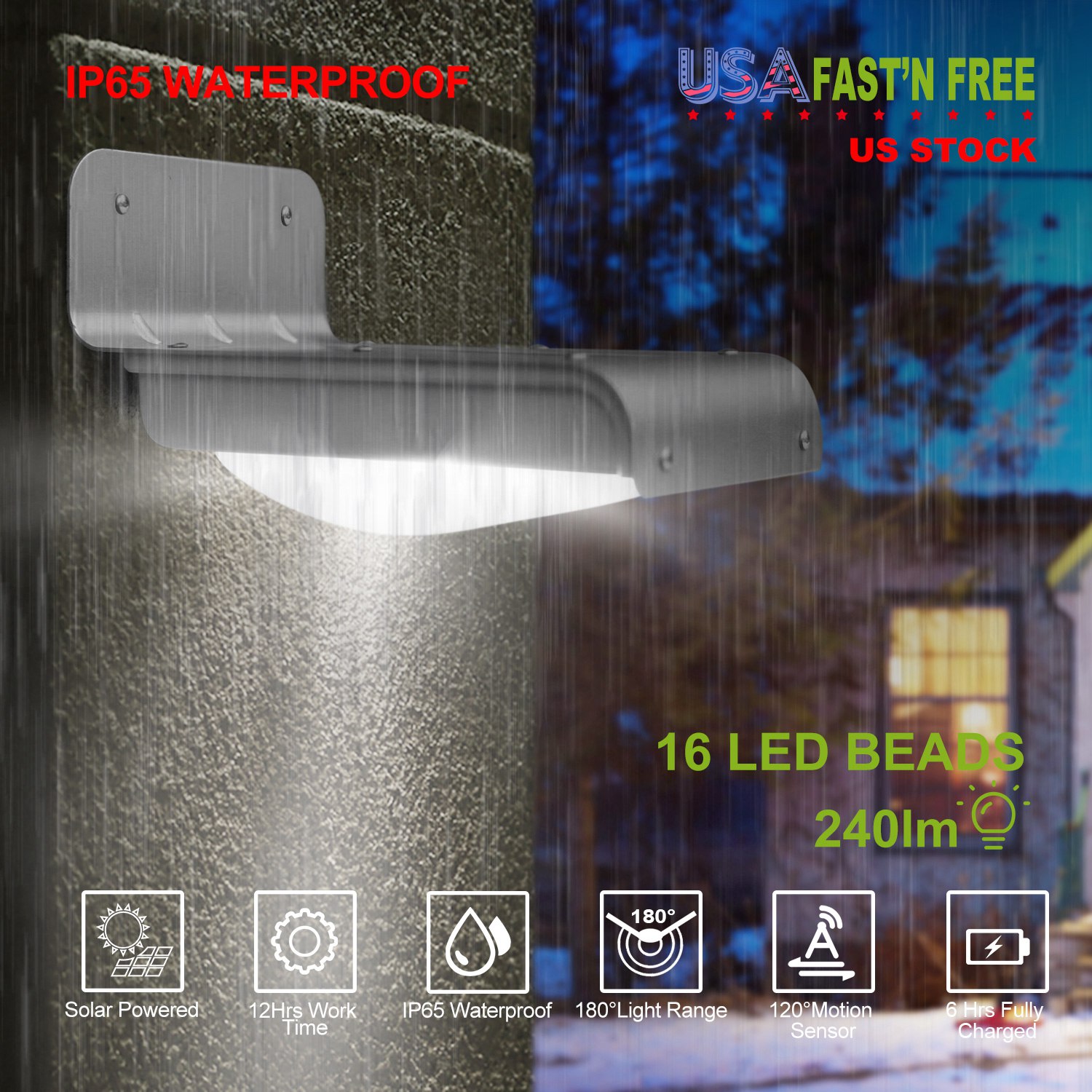 Our Outdoor Solar Wall Light offers an optimal solution for 180° illuminating with up to 240lm at dark night, which features upgraded 120° PIR motion sensor, inbuilt bright 16 LEDs, 800mAh rechargeable battery, fully charged about 6Hrs under the direct sunlight and light for 12Hrs. During the day the solar light will automatically switch off to save energy; and it will auto turn on in dim mode at night/darkness, then changes into full bright mode for 30S when motion is detected within 9.84ft. IP65 Waterproof performance and easy installation enables it to be widely used in your garden, stairs, deck, porch, patio, pond, garage, driveway, pathway or any outdoor location that needs a light.