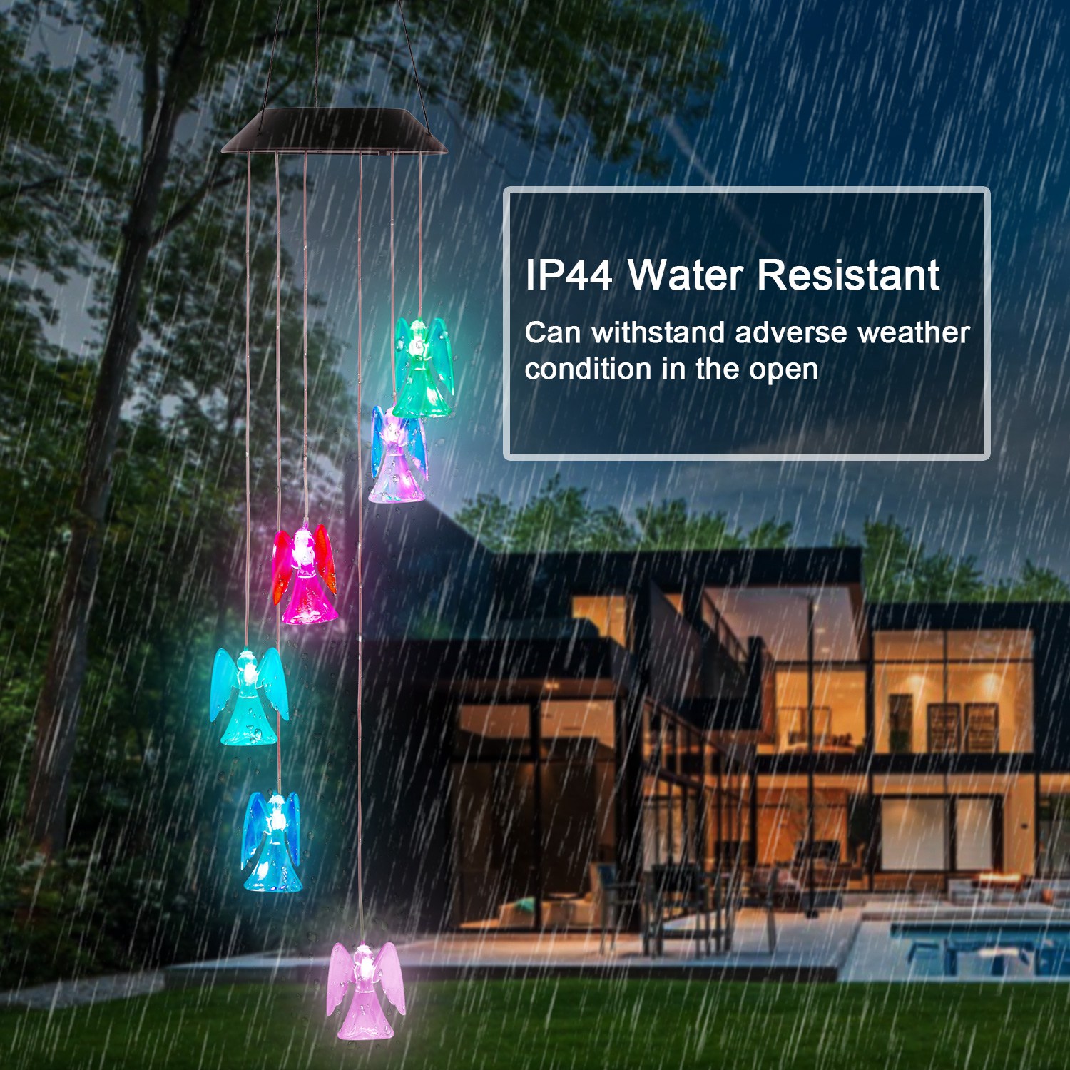 Our solar power wind chimes, featured with beautiful lifelike angel and multiple colors changeable lights can greatly decorate the night atmosphere and decorate your mood. You can hang it on roof overhangs or trees around your patio or garden with its IP44 water-resistant performance. Additionally, it is charged by solar energy, no extra electricity cost. And it can automatically turn on at dark and automatically turn off in day time.