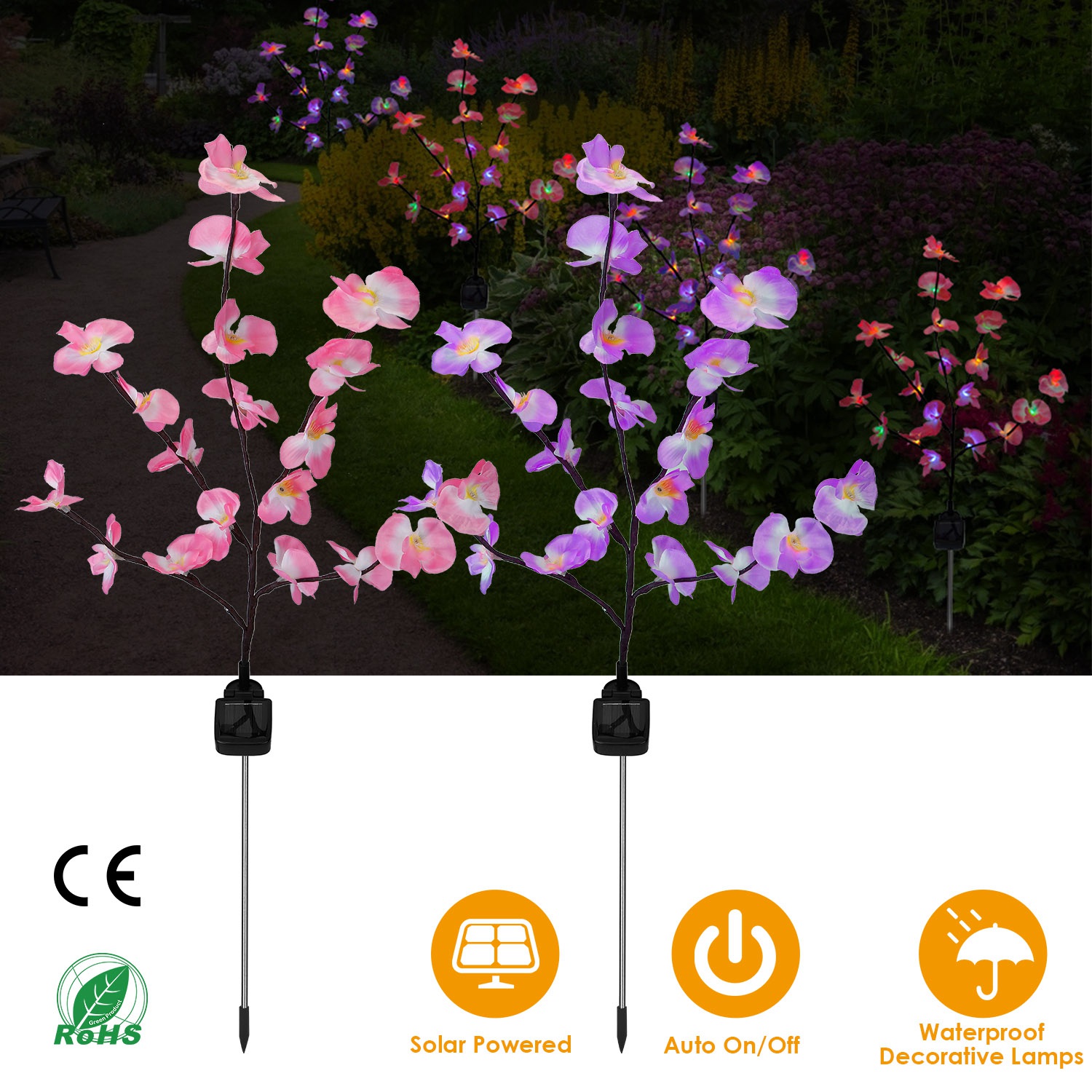 Are you looking for some elegant solar light for outdoor decoration? This is a wise choice for your outdoor decor! Lifelike orchid of two colors features a built-in solar panel that absorbs sunlight by day. It will automatically turns on at dusk, creating a warming and funny atmosphere for you. It is great to decorate your garden, lawn, pathway, patio, walkway, fence, backyard etc..