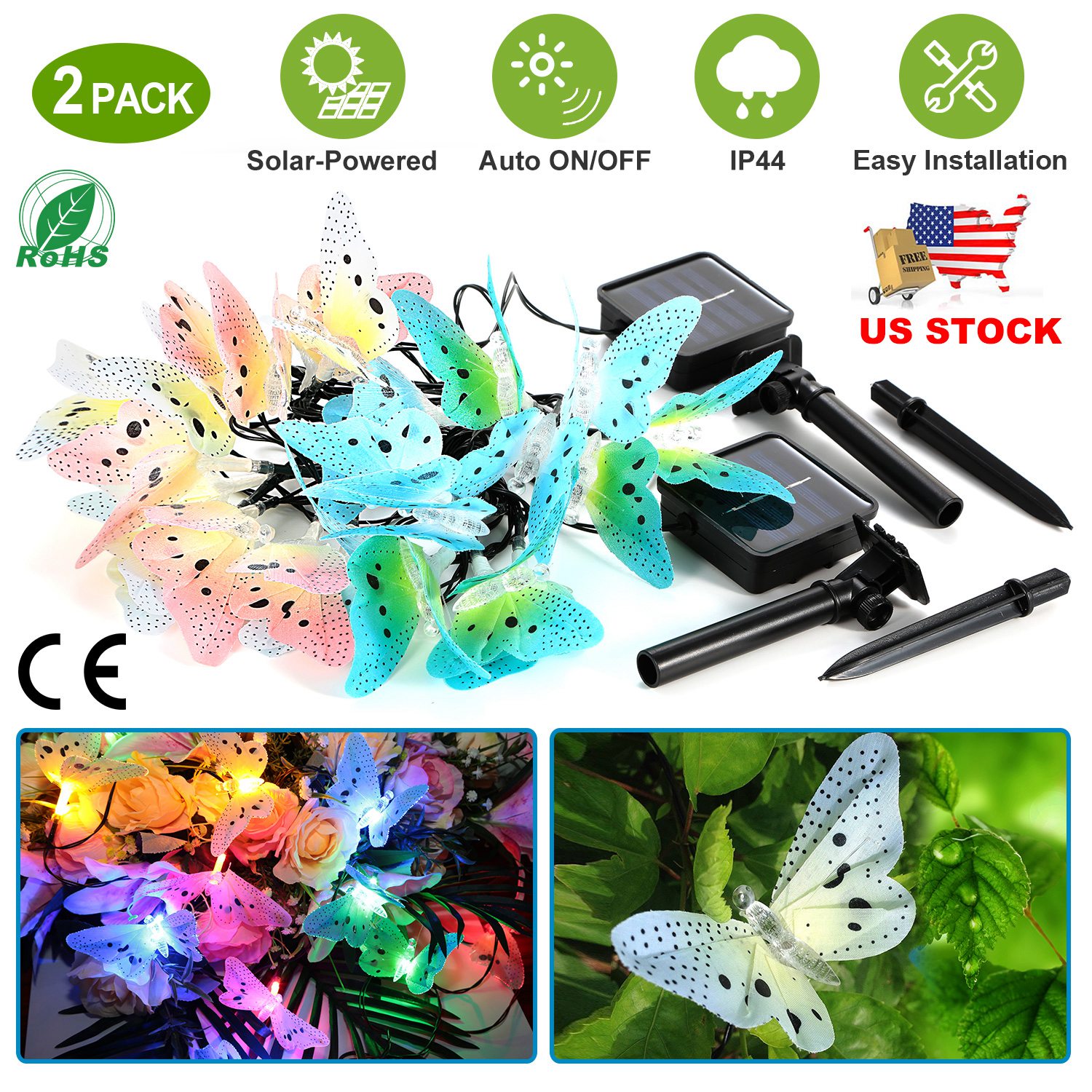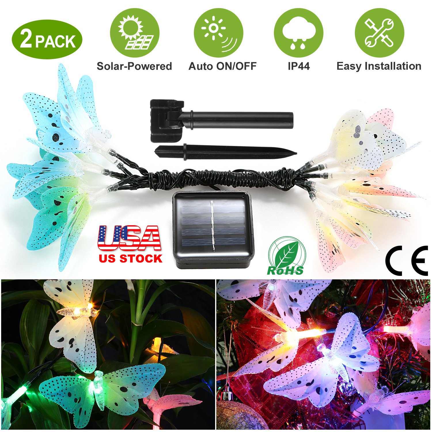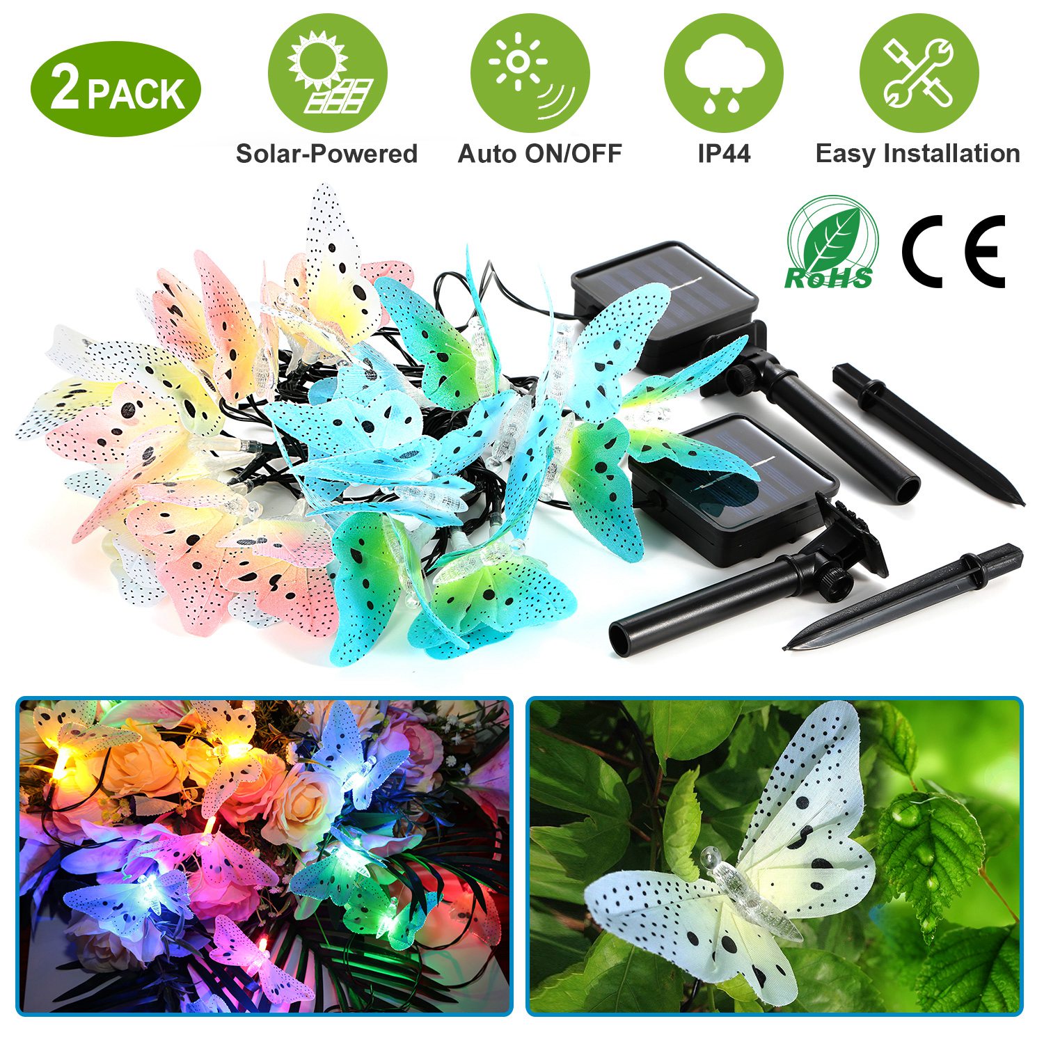 Home > 2 Pack Solar Powered String Lights 3.8m/12.48Ft 12 LEDs Butterfly Lights IP44 Waterproof Multi-Color Lights for Christmas Decorative Garden Fence Pati